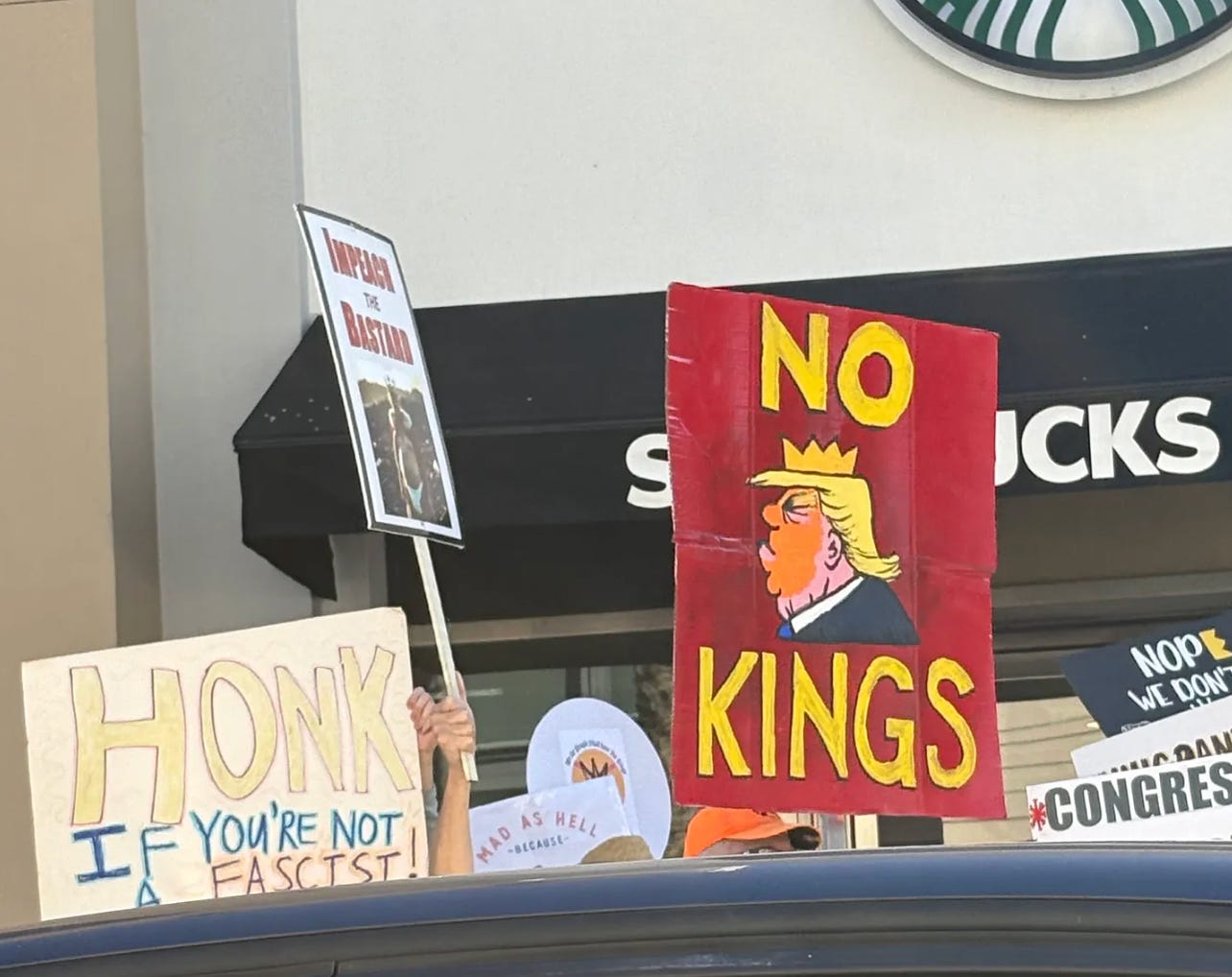 Right now, the olds at the No Kings crowds are only holding Starbucks cups and signs. In the face of the upcoming Nazi reality they’re being sold as fact, what would it take to get them to pick up sticks, or knives — or even guns?