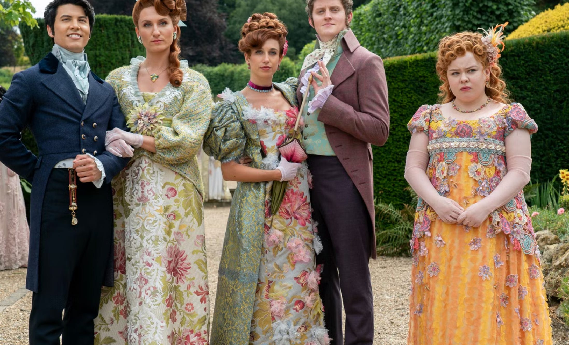 The most recent mainstream bodice-ripping period romance that gained a huge audience was, of course, Bridgerton. It became famous for its diversity race-swap casting (black Queen Charlotte, etc.) and zesty soft-core sex. Every time I watched a clip or two to see what the fuss was about, I wanted to vomit from the bad acting and charisma-free leading men.